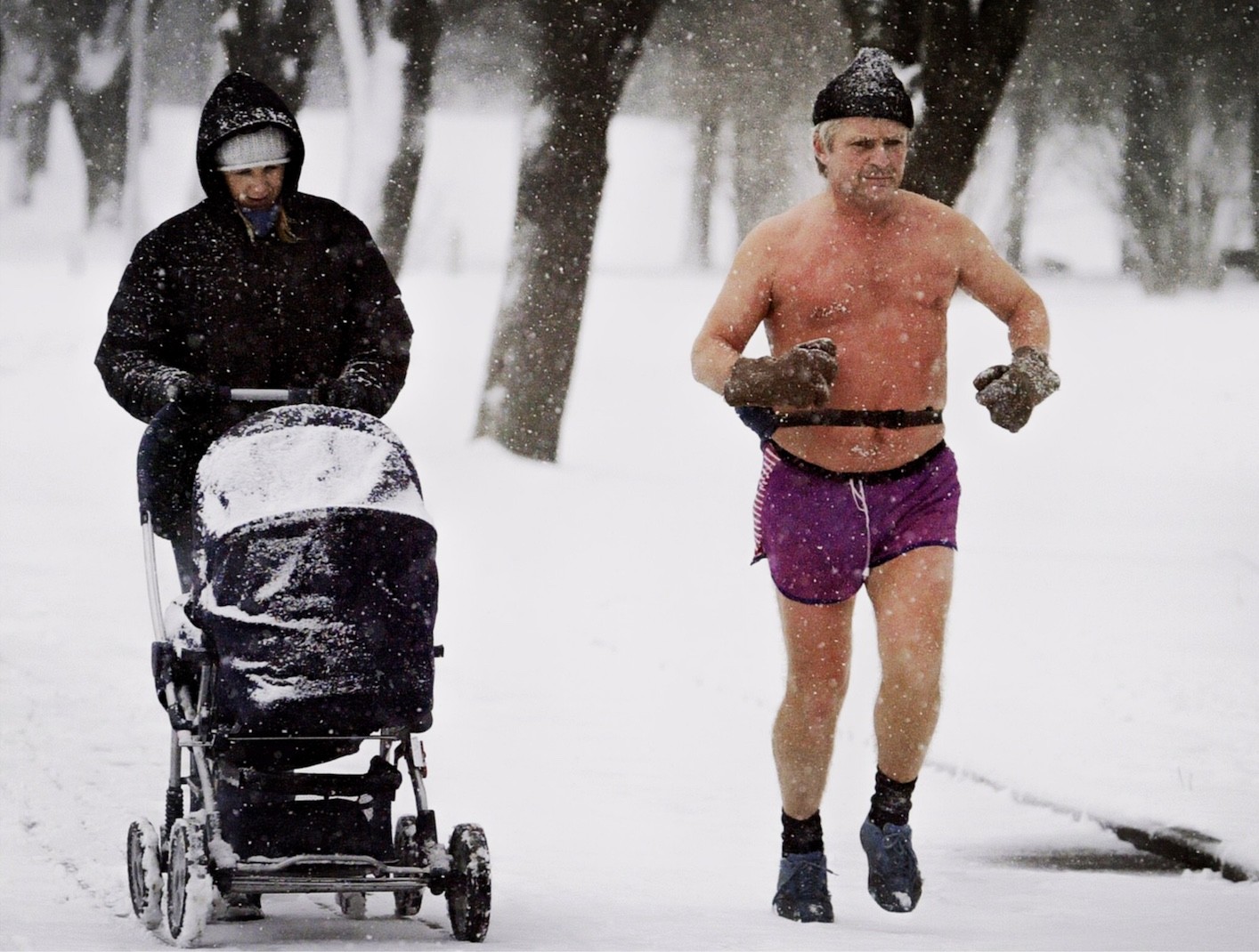 A man runs in the snow next to a woman pushing her child, Minsk, Belarus, 2005 - by Viktor Drachev (1957), Belarusian