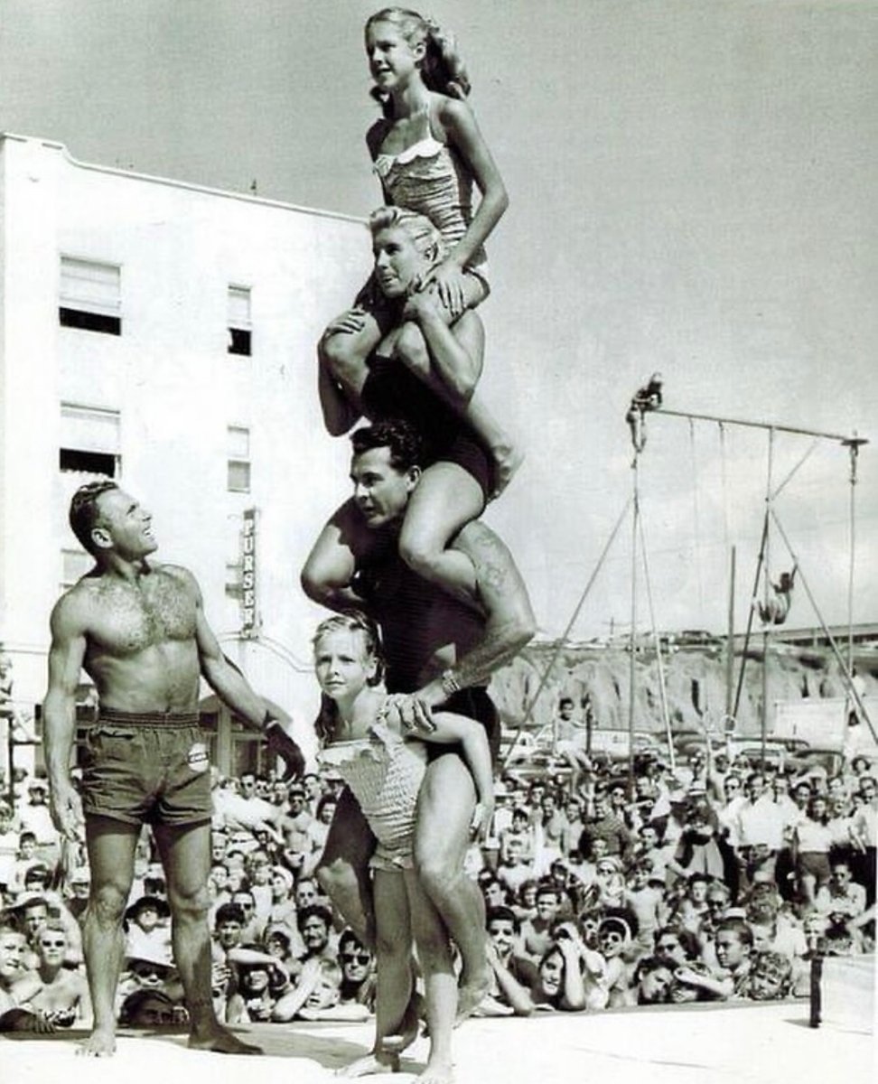 9-year-old girl April, carries her family on her back (over 425 lbs) in Muscle Beach, Cal, 1945. https://t.co/iBTu8ilnfK