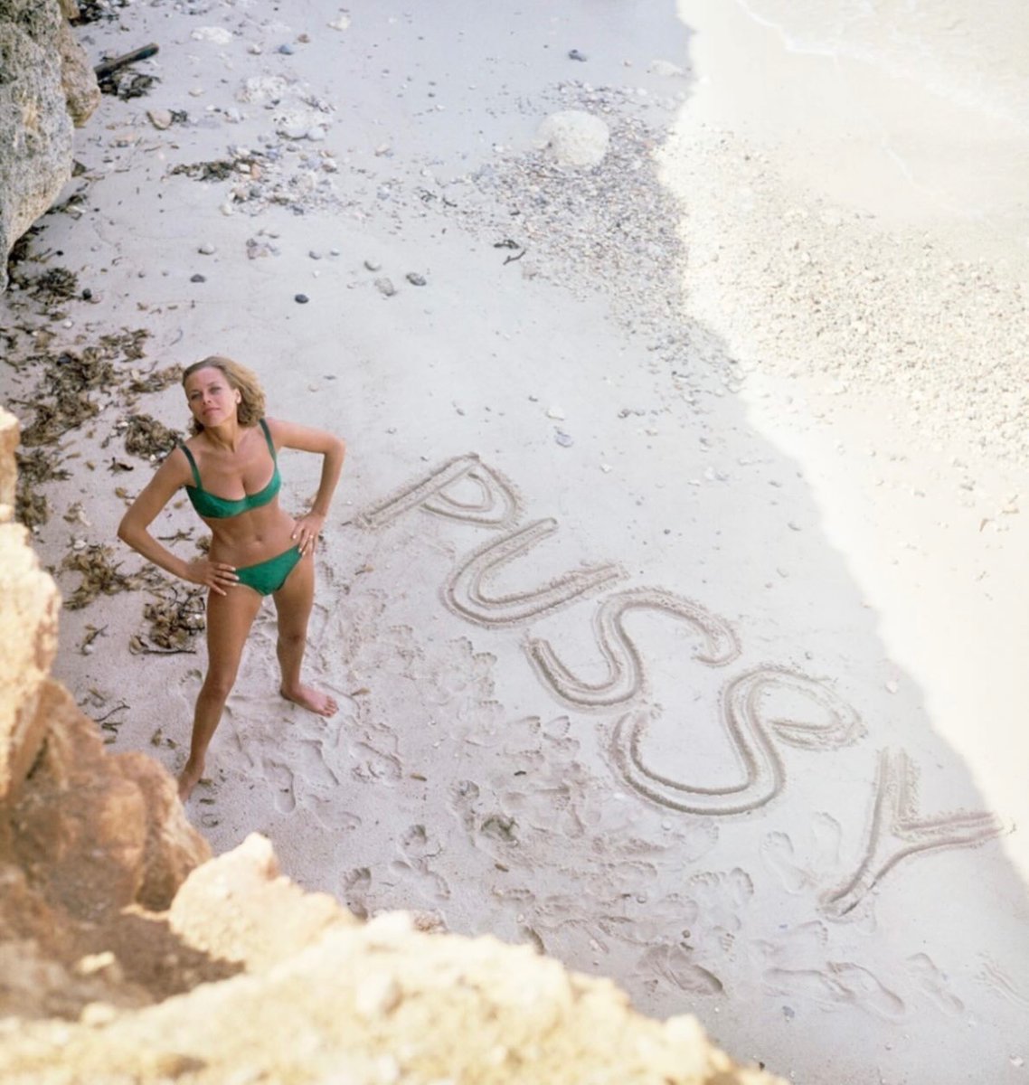 Honor Blackman on a beach for a publicity shot for the 1964 James Bond film ‘Goldfinger’. Written in the sand is the name of her character, Pussy Galore. https://t.co/MPBoe3FnPA