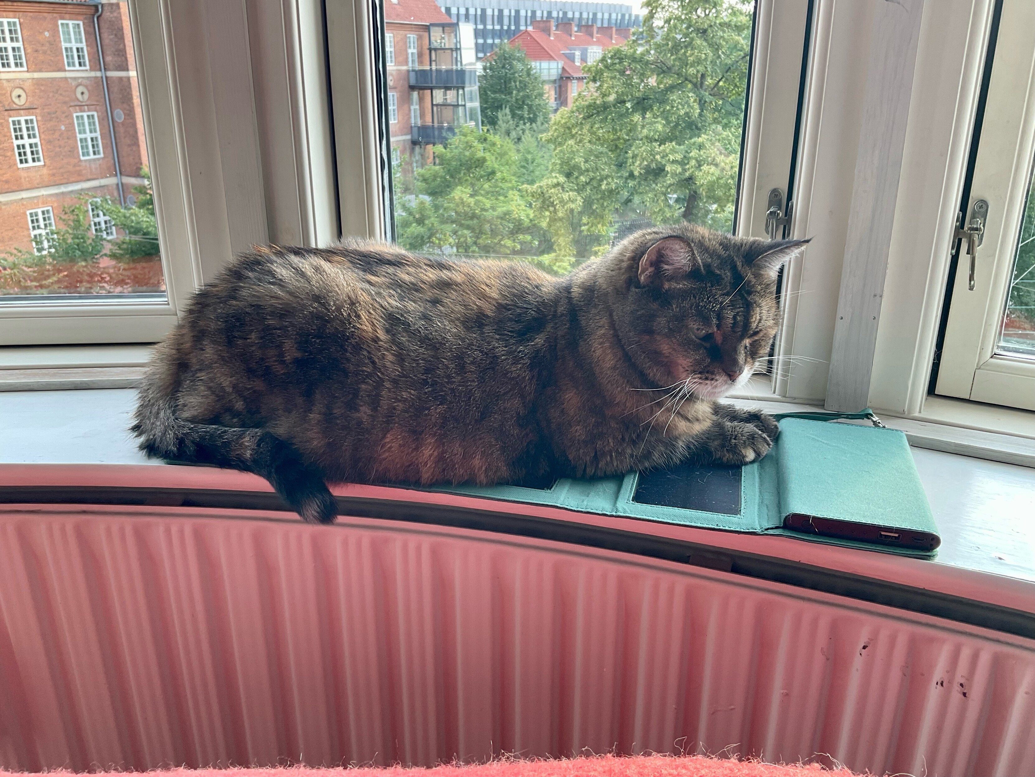 Molly is charging my solar panels 😺 These panels keep my cell phone charged.