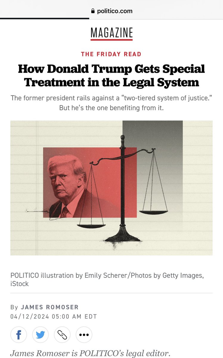 美国的确有川普说的“两套司法系统”,这篇文章详细归纳了川普受到的没有别人能享受的优待:涉嫌犯重罪被捕可不戴手铐、不怕大头照、不入狱等待过堂,可以肆意攻击法官、法官家属、检察官、证人,最高法院帮他推迟审理,有一个审案法官是他任命的,可以只交一小部分保证金。 https://t.co/oo0Xk37LqE