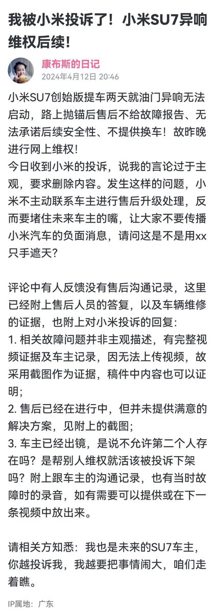 崭新的小米汽车行驶中途会踩不动油门抛锚,这种车也能上路?开小米汽车的不仅是勇士,还是交通安全潜在威胁。敢在网上抱怨,反过来被小米投诉,说是“抹黑”“主观描述”。 https://t.co/XUwgsOhsP2