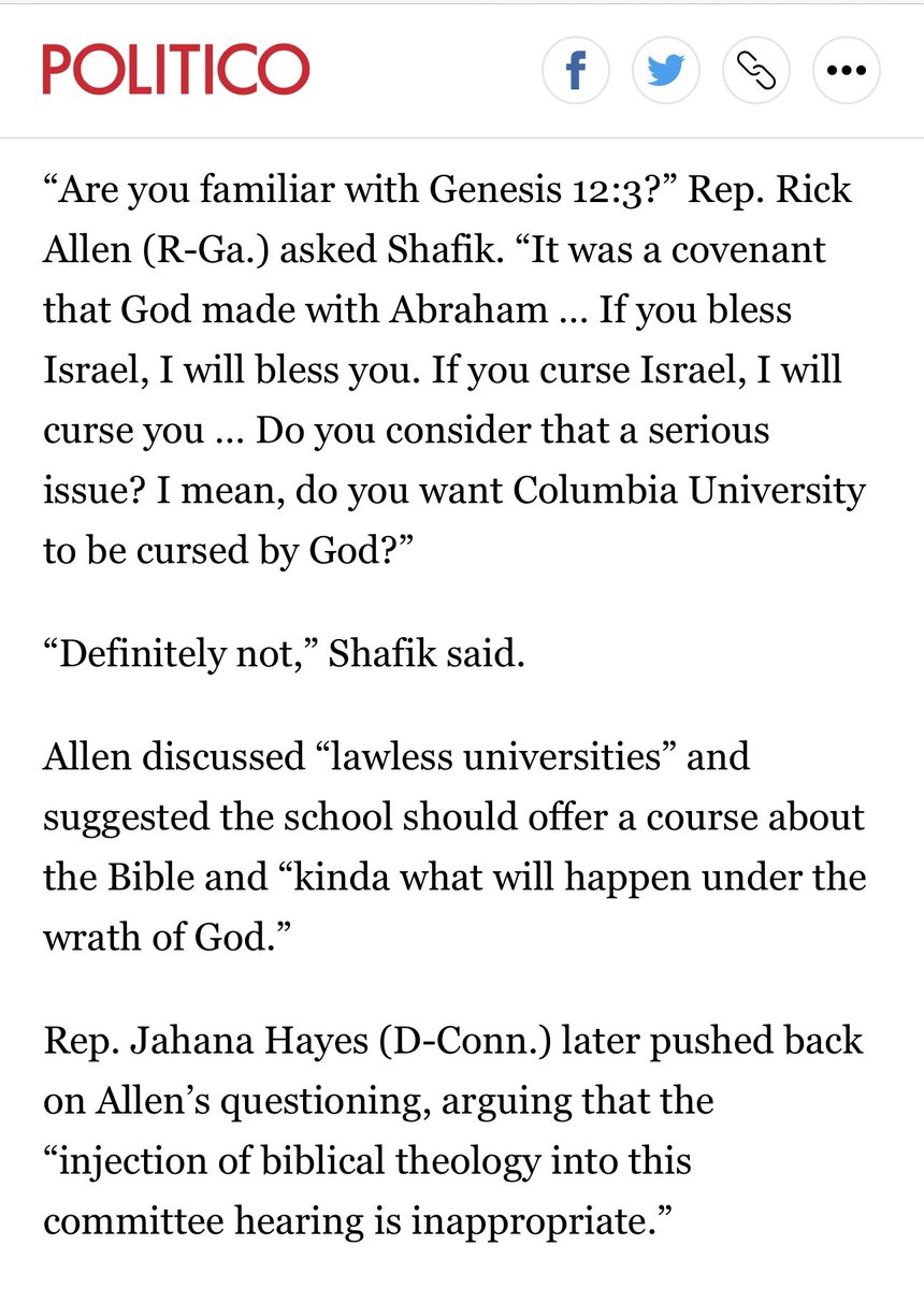 今天众议院调查哥伦比亚大学反犹主义活动的听证会,共和党议员引用基督教圣经》“如果你诅咒以色列,上帝将诅咒你”,建议哥伦比亚大学让学生学《圣经》,免得被上帝诅咒,要把哥伦比亚大学办成神学院。哥伦比亚大学校长一开始不愿说“从河到海巴勒斯坦将获自由”是反犹口号,后来同意那是反犹口号,表示喊这句口号的学生将会受处分。校园里连呼吁让巴勒斯坦得自由的口号都要禁止,如此“言论自由”,共和党喜欢。为什么共和党只刁难私立大学校长?因为知道他们得罪不起犹太富豪。怎么不把伯克利校长也叫去听证?