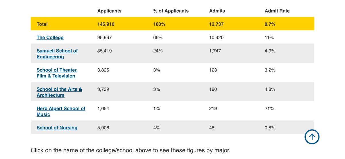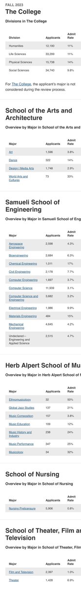 【2023年秋季UCLA各学院新生录取率】文理学院:11%(人文学科11%,生命科学11%,物理科学14%,社会科学9.8%),工程学院:4.9%(计算机科学3.1%,生物工程6.3%,电子工程9.9%,化学工程17%),戏剧影视学院:3.2%(影视1.0%,戏剧6.9%),艺术与建筑学院:4.8%,音乐学院:21%,护士学院:0.8%。 https://t.co/iTroA0nmWK