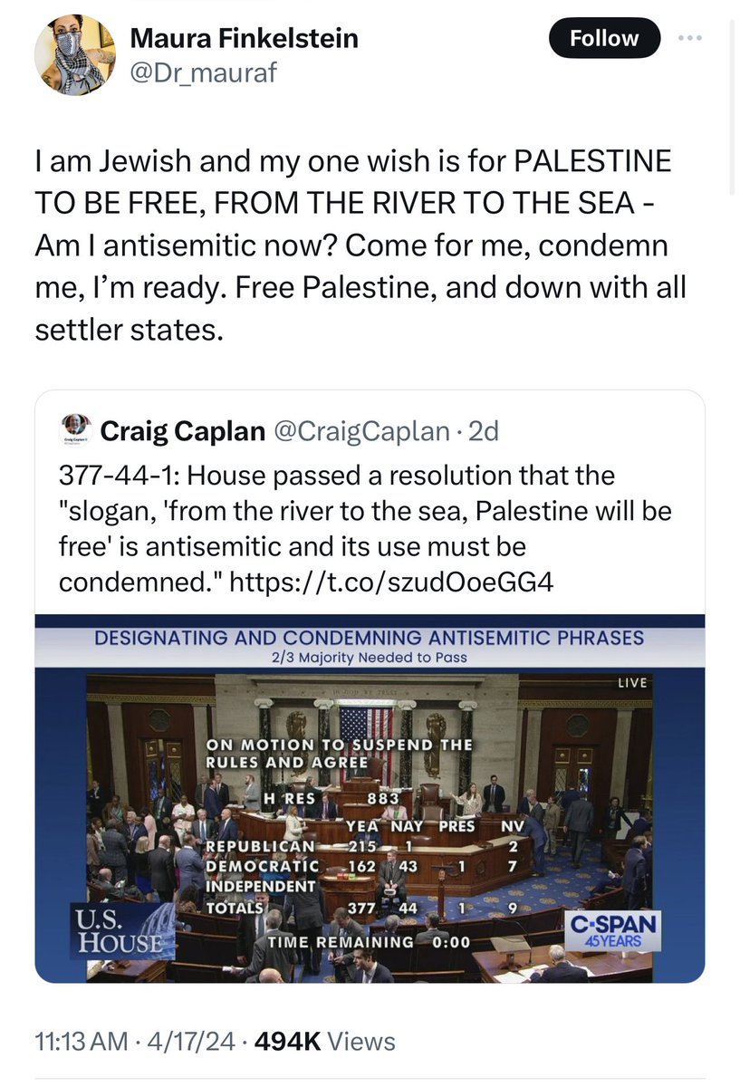 美国众议院377-44-1通过决议,声称“从河到海巴勒斯坦人将获自由”是反犹主义口号、要受谴责。美国公民联盟不去起诉众议院公然违反宪法第一修正案?这个犹太教授高喊“从河到海巴勒斯坦人将获自由”,是不是也要被当成反犹主义者开除?这才是美国在搞文革,没见“言论自由保守派”对此吭一声。 https://t.co/dQFmJM559U