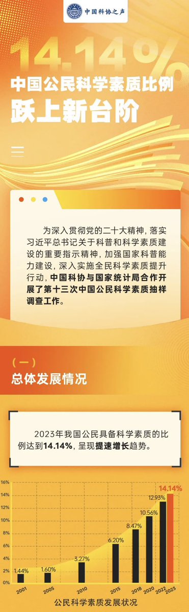 中国有“科学素质”的公民比例年年剧增,20年增长10倍,已经达到14.14%,按这个增长速度,很快就要100%了。 https://t.co/pbxS6L2vHq