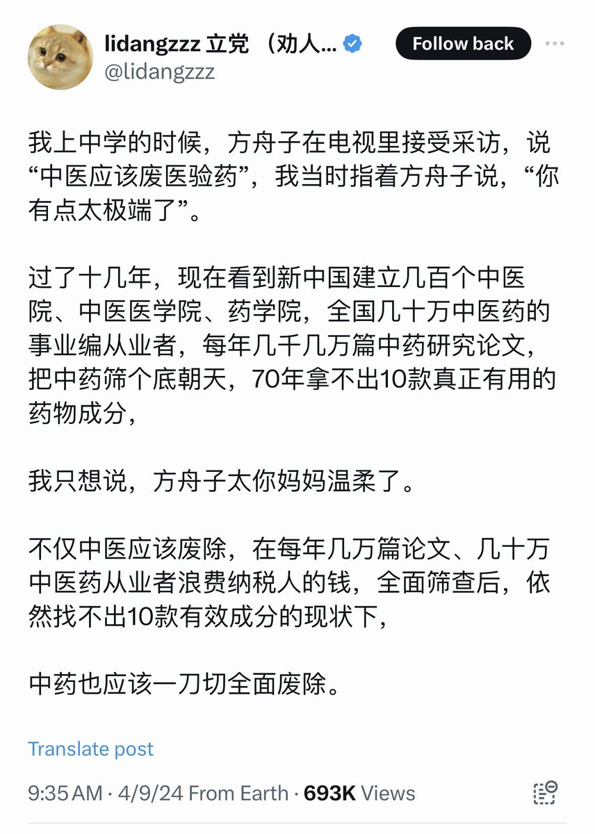 我几年前写过一篇文章分析过对中医药的四种看法:“存医存药、废医存药、废医验药、废医废药”。 https://t.co/lpHQCldHMl