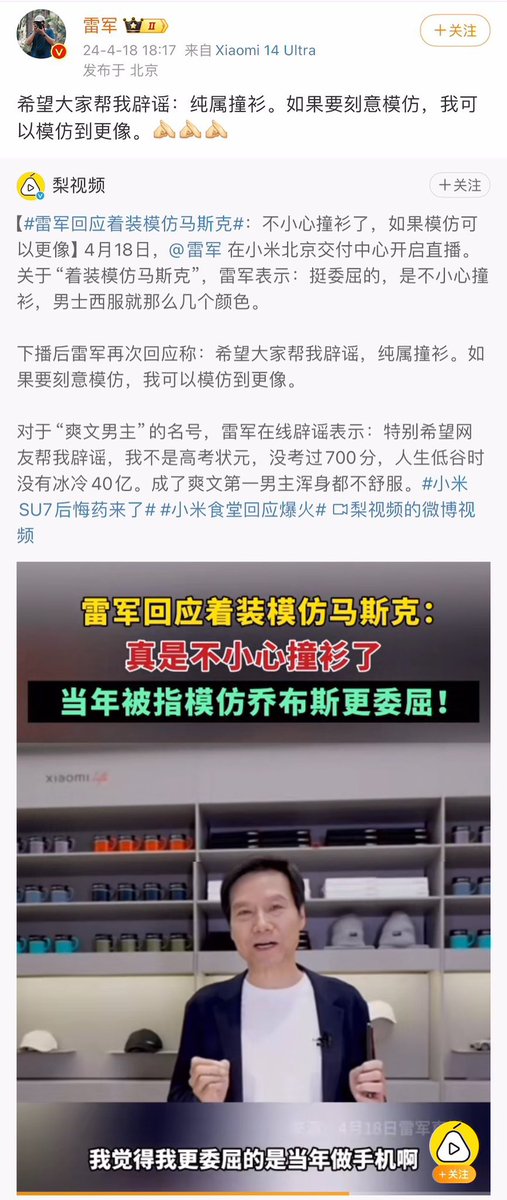雷军说他不是刻意模仿马斯克,嗯,那就是下意识模仿,与马斯克合而为一了,不愧是雷斯克。 https://t.co/QaogGB3rm8