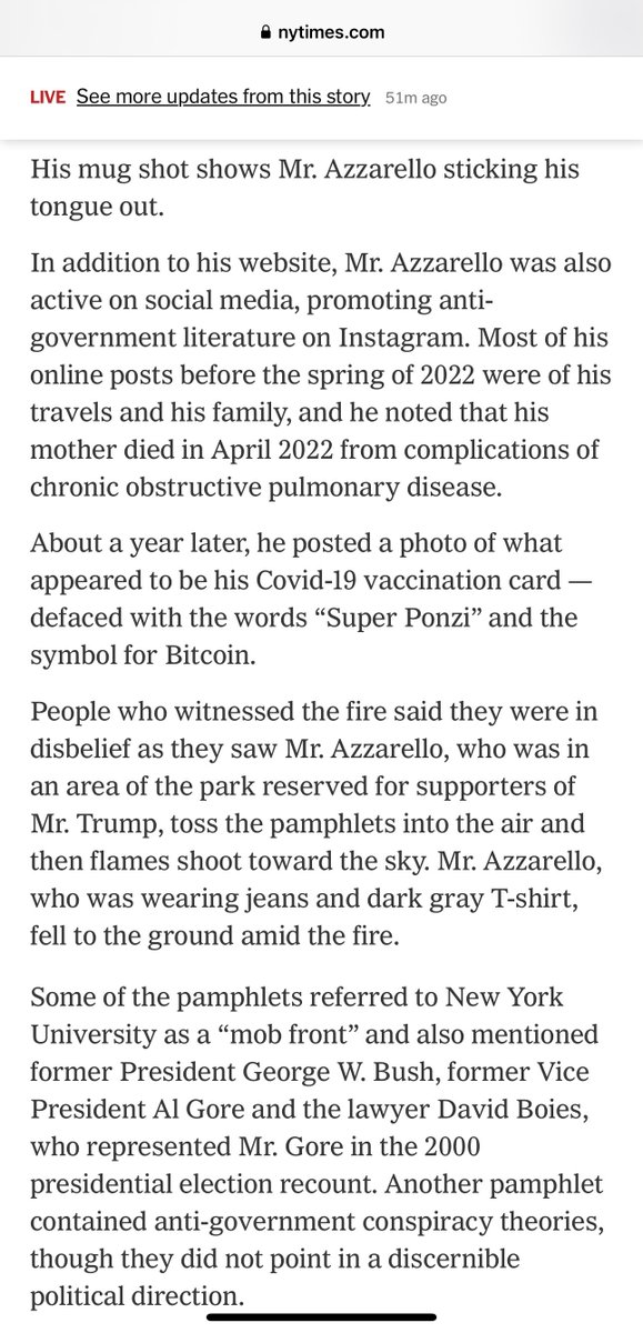 一个反政府阴谋论者从佛罗里达赶到曼哈顿,在审理川普案的法院门口散发传单后自焚。与此同时,川普在法庭上第三次睡着了。 https://t.co/jjEYGPKbTQ