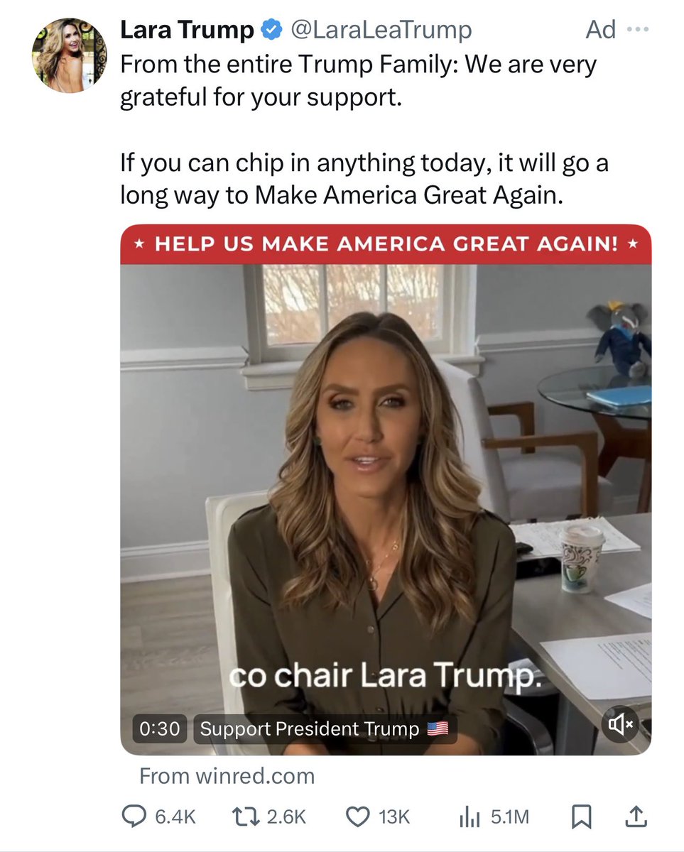 推特时间线上满屏都是川普儿媳妇要钱的广告。推特以前不登政治广告,现在只好靠登共和党的政治广告赚钱。 https://t.co/5S2MuRIRpY