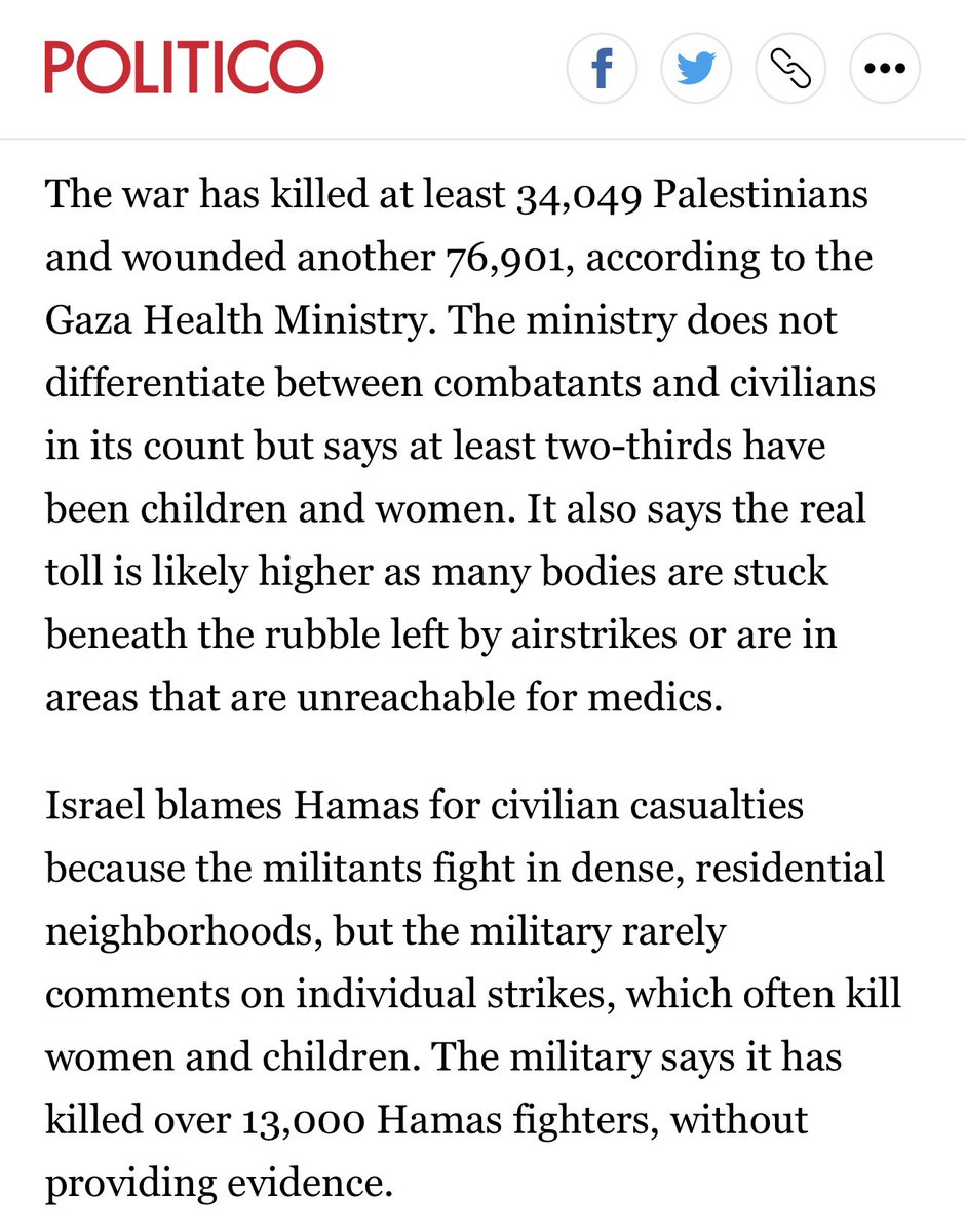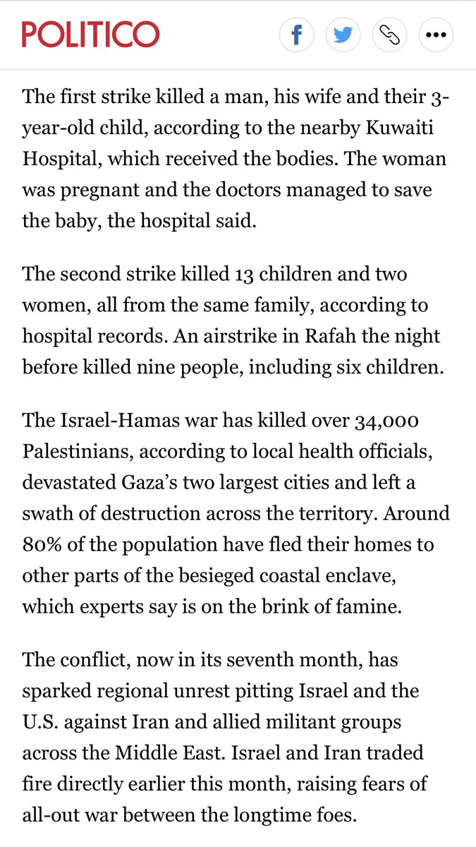 以色列一天两炸加沙的拉法,第一次轰炸炸死一个男人、他的妻子和他们3岁小孩。他妻子怀孕,医生设法救了婴儿。第二次轰炸炸死13个小孩和2个妇女,都来自同一个家庭。到现在以色列已在加沙杀死至少34049人,其中三分之二是妇女、儿童。另外杀伤至少76901人。 https://t.co/LC0A3EcCrh