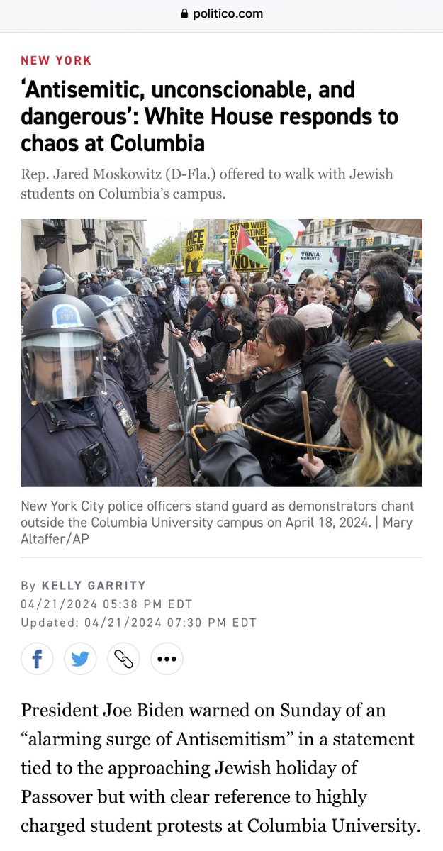 拜登声称哥伦比亚大学学生示威是“反犹主义、没良心和混乱的”,看来是不想要大学生的选票了。大学生向来是民主党的铁盘,往年大选民主党都忙着拉大学生选票。而今年大选,拜登、民主党大佬都不敢去大学校园活动、发表毕业典礼演说,知道去了会遭到抗议。当初如果没有大学生的支持,拜登当不上总统。 https://t.co/oHwRgbGKJX