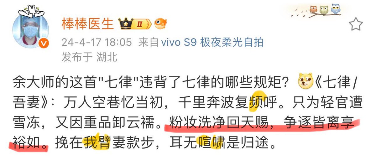 “文化大师“余秋雨显然不懂,既然写着“七律”而不是打油诗,那么起码得符合七律的格律要求,大部分字要符合平仄,中间两联要对仗,否则就无所谓“律”了。至于用语的不通,倒在其次。 https://t.co/mRqK768pvs