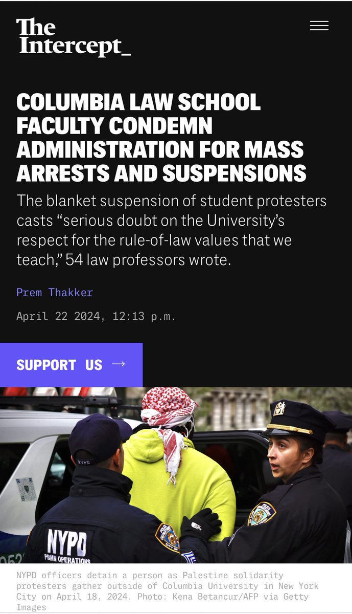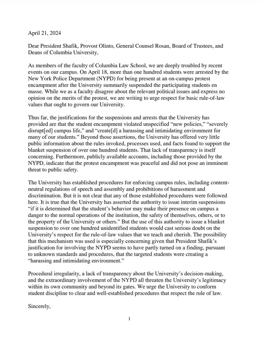 54名哥伦比亚法学院教授致信校长,谴责大规模逮捕和处罚学生。哥伦比亚大学校长本来宣布今天午夜出动警察和国民卫队清场,现在说推迟到早晨8点。这个校长既不是学者也不是教育家,本来是个银行家,让她当校长就是看中了她能拉到钱。 https://t.co/yOxXYgCOVh