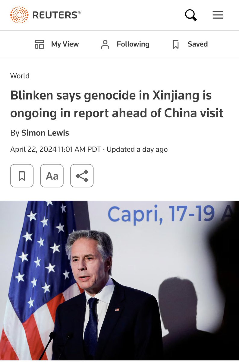 布林肯还好意思指责中国政府在新疆搞种族灭绝,我还以为在以色列在加沙搞种族灭绝之后不好意思再提了。中国政府至少没有以反恐的名义把新疆炸成一片废墟,炸毁所有大学、医院、文化遗址,杀死上万名妇女儿童,被安理会命令停火,被国际法庭发布禁制令。 https://t.co/LzATe8iho7