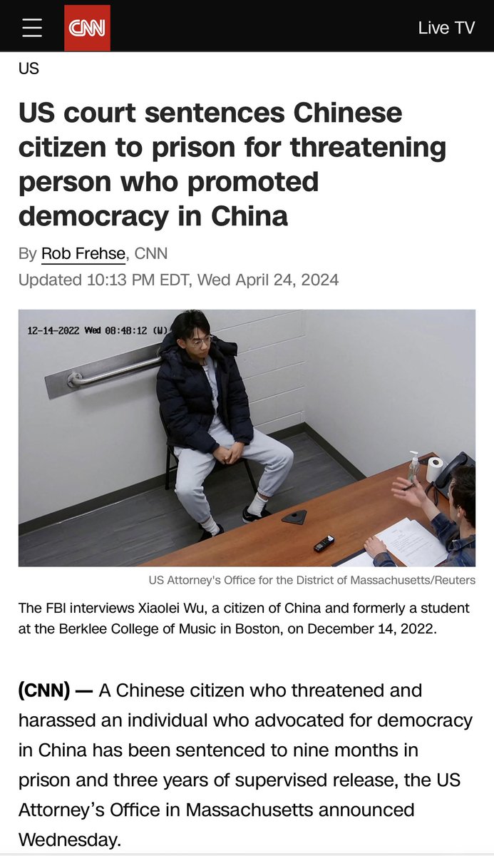 波士顿伯克利音乐学院中国学生吴啸雷于2022年在微信聊天群威胁在校园贴“反动海报”的中国同学,今年年初被陪审团定罪,今天被法官判刑9个月和3年监视。他服完刑就会被遣送回国。回国会不会跟孟晚舟一样成为受美国迫害的“民族英雄”? https://t.co/z6KihRIfJf