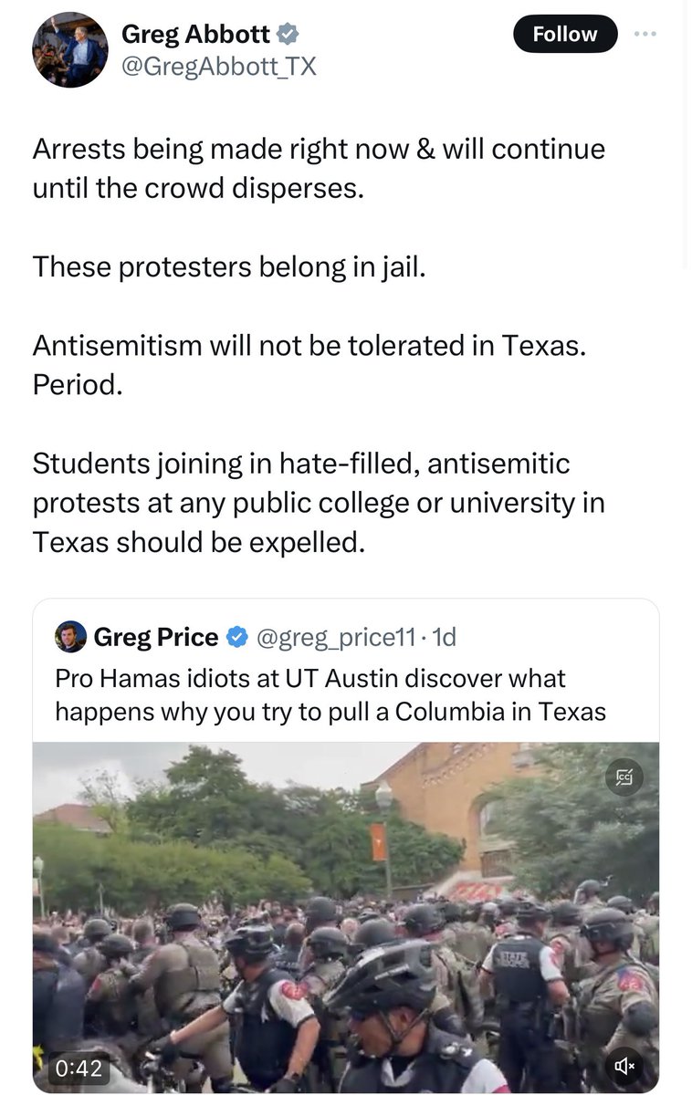 得州恶魔州长杀气腾腾地宣布,大学生示威是“反犹主义”,示威者都应该被投入监狱,得州公立学校所有参与示威的学生都要被开除。2019年他曾经宣布签署“保护校园言论自由法案”,当然保护的只是他认可的言论的自由。 https://t.co/4RaFSCZEW6