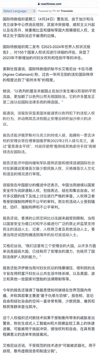 国际特赦组织最牛,美国、俄国、中国、伊朗放在一起批。这话说得很好:“以色列的盟友未能阻止在加沙发生难以形容的平民流血,更加剧了以色列公然无视国际法。它的许多盟友正是二战以后国际法律系统的缔造国。”以后谁还会相信国际法? https://t.co/aZS1cVfNU7