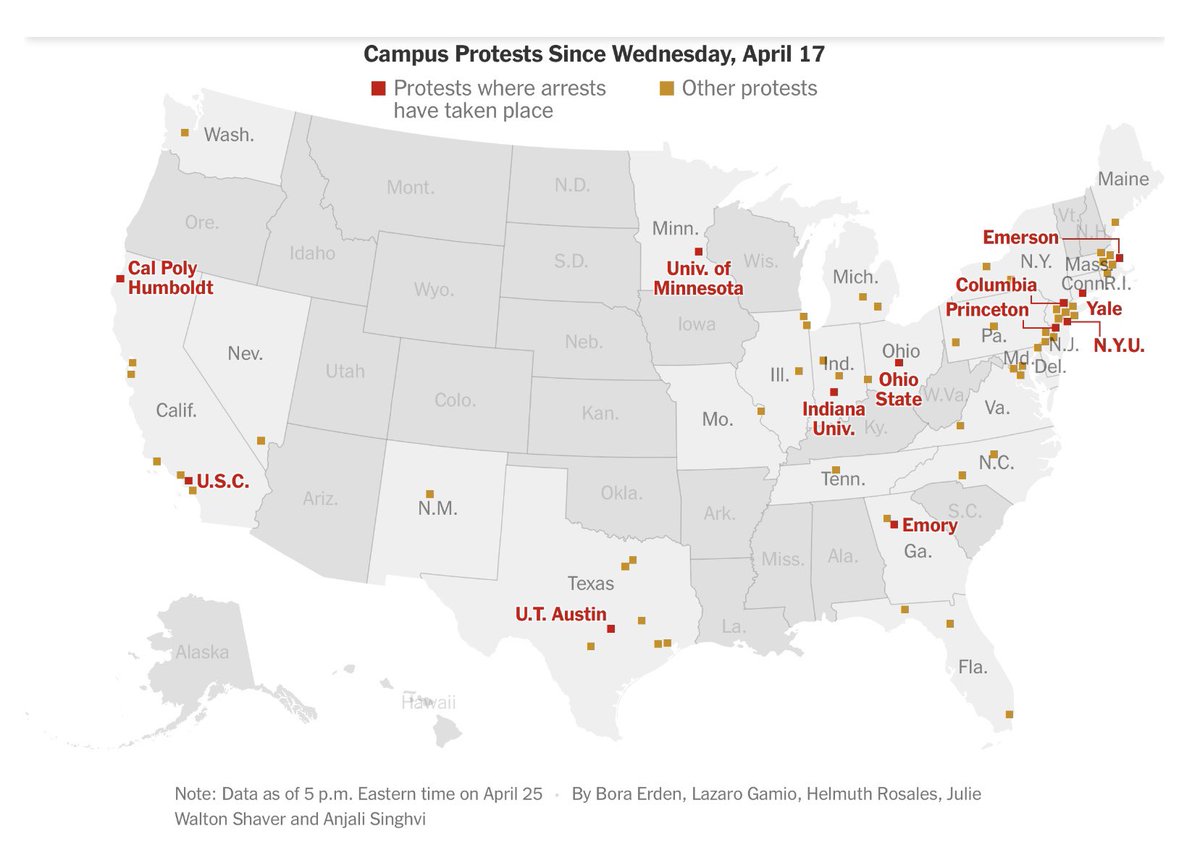 美国60多所大学都爆发反对以色列示威,其中11所大学警察进校园抓捕示威学生、教师。纽约时报这张图有一点不准确。加州技术大学洪堡分校没有学生被抓走。学生们占领了学校行政楼,警察试图进入抓人,遭到学生激烈抵抗,其他学生闻讯赶来声援,警察就撤了。占领行政大楼才是美国学生运动传统,现在其他学校只是占领草地,小打小闹了。