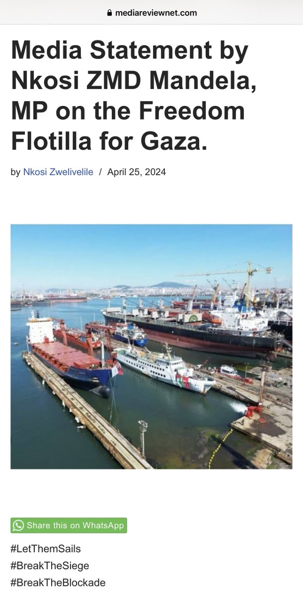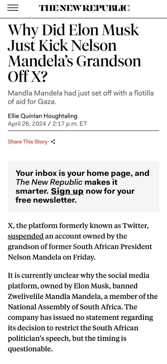 南非国会议员、曼德拉的孙子宣布参与向加沙运输援助物资的“加沙自由船队”,然后他的推特账号就被封了,嗯,“绝对言论自由”。 https://t.co/Q56iURSRaC