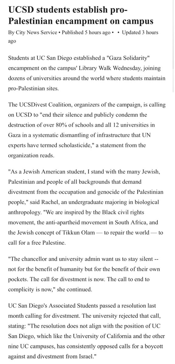 受昨天发生在UCLA校园的以色列暴徒暴力事件刺激,UC圣地亚哥的学生今天也扎营抗议,要求学校公开谴责以色列炸毁加沙80%的学校和全部12所大学,要求学校剥离与以色列对巴勒斯坦实行占领和种族灭绝相关的投资。组织者是一名犹太学生,要不要说她是反犹主义?营地在图书馆边上的草地上。 https://t.co/jnFNZwM41f