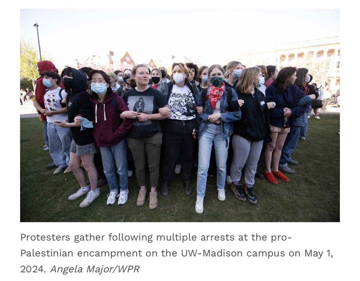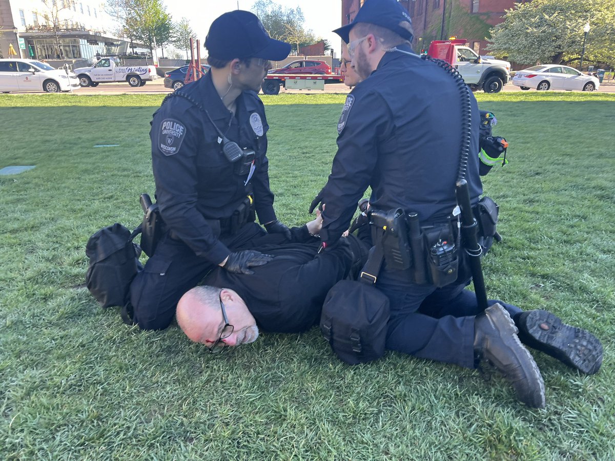 今天警察对威斯康星大学麦迪逊分校声援巴勒斯坦的示威营地清场,抓走34人,包括两名参与示威的教授。随后学生们又在原址扎营。到现在有100多所美国大学都爆发反以色列的抗议,有30多所大学警察进校园抓人,为上世纪六七十年代反越战示威以来美国大学校园最大规模的抗议运动。 https://t.co/No0wlP8Bav