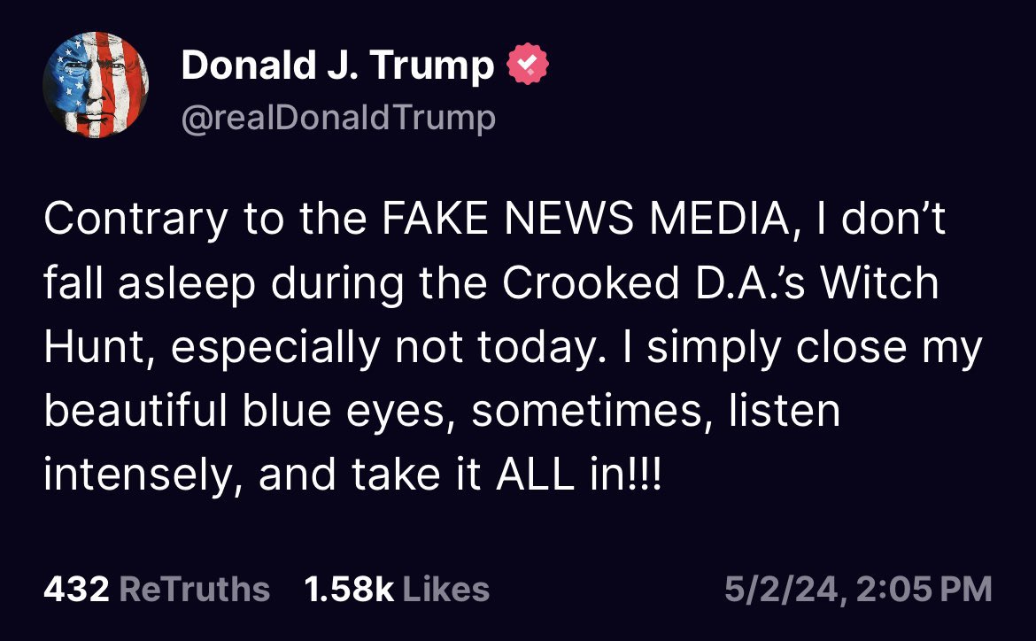 川普说他没有在法庭上睡觉,“我只是有时候闭上我美丽的蓝眼睛专注地听。” https://t.co/Cn2m0sBX34