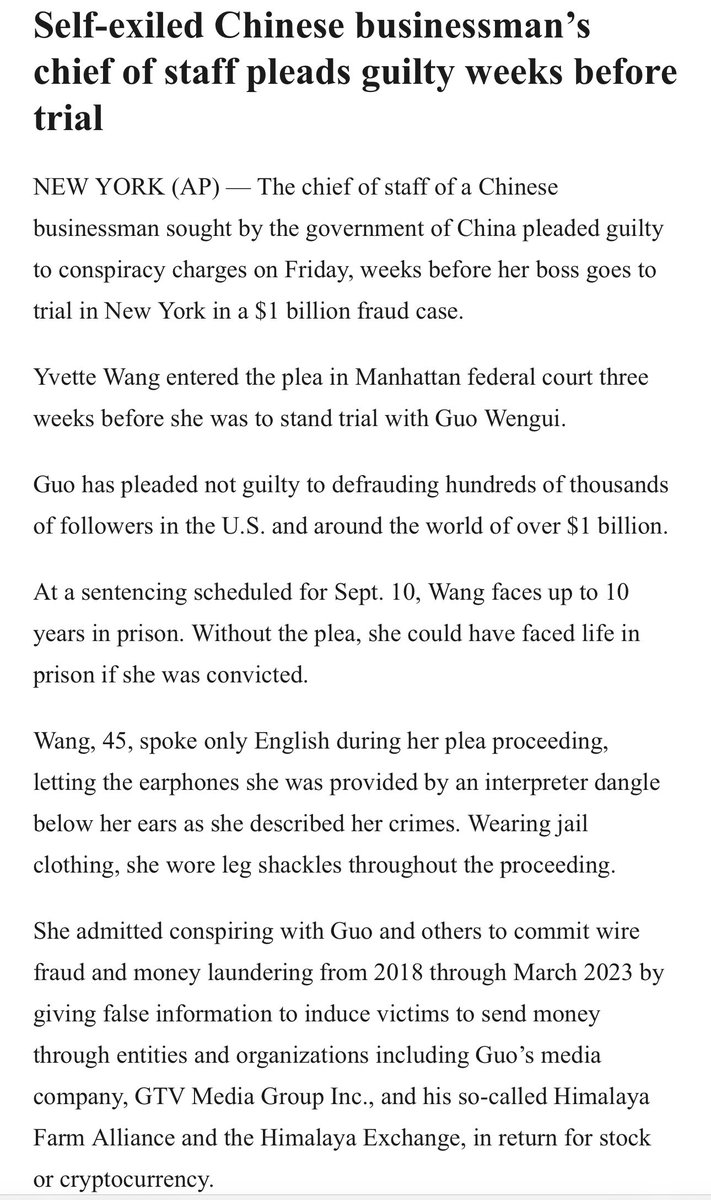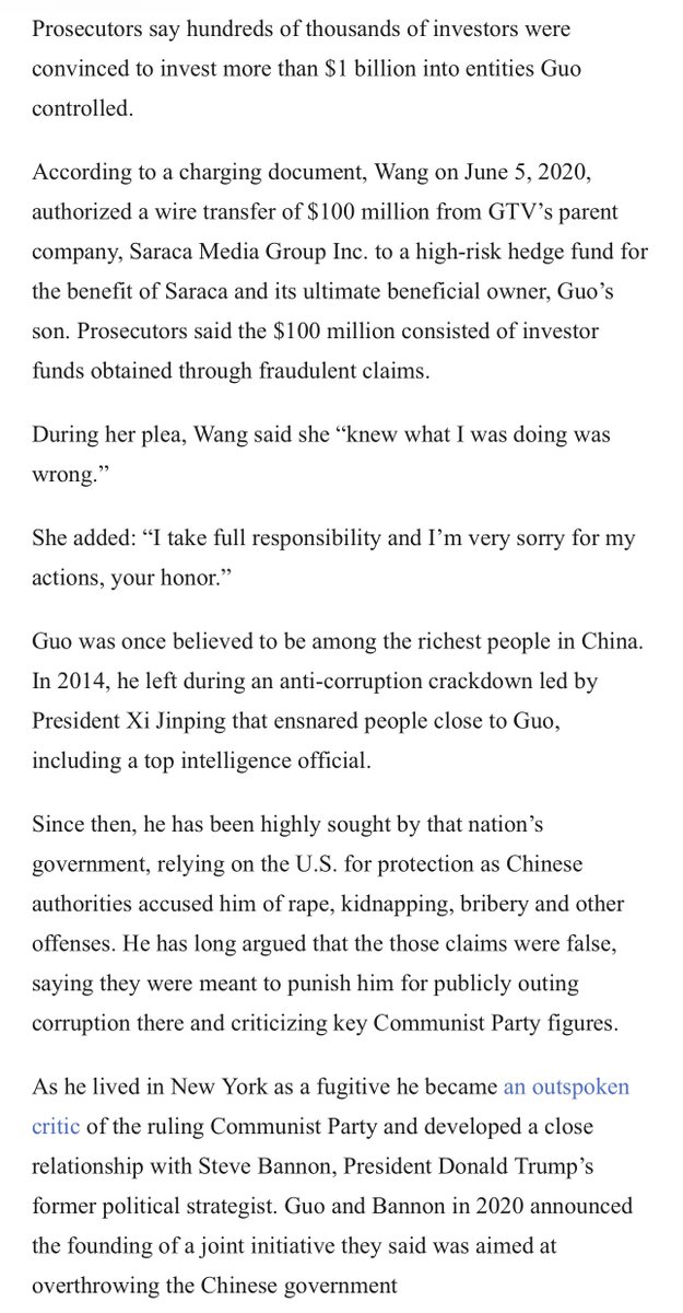 郭文贵的管家王雁平今天认罪,承认和郭文贵一起诈骗10多亿美元。如果不认罪,最高判终身监禁,认了两项罪名,最高判10年。 https://t.co/Yb1GDCg62D