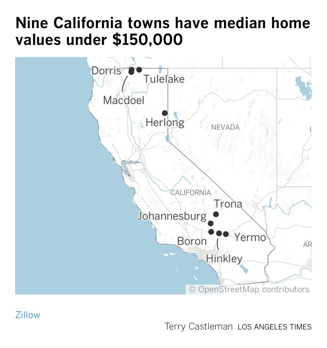 加州有23个城镇房价中位数超过300万美元。还有9个城镇房价中位数不到15万美元,其中四个在北加州的高山,五个在加州中部的沙漠。 https://t.co/FaLBztDuyl