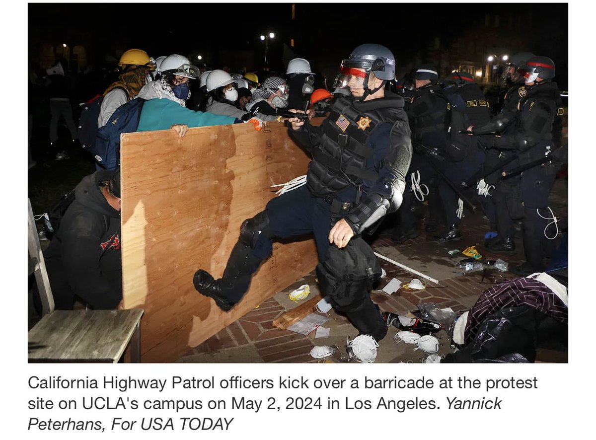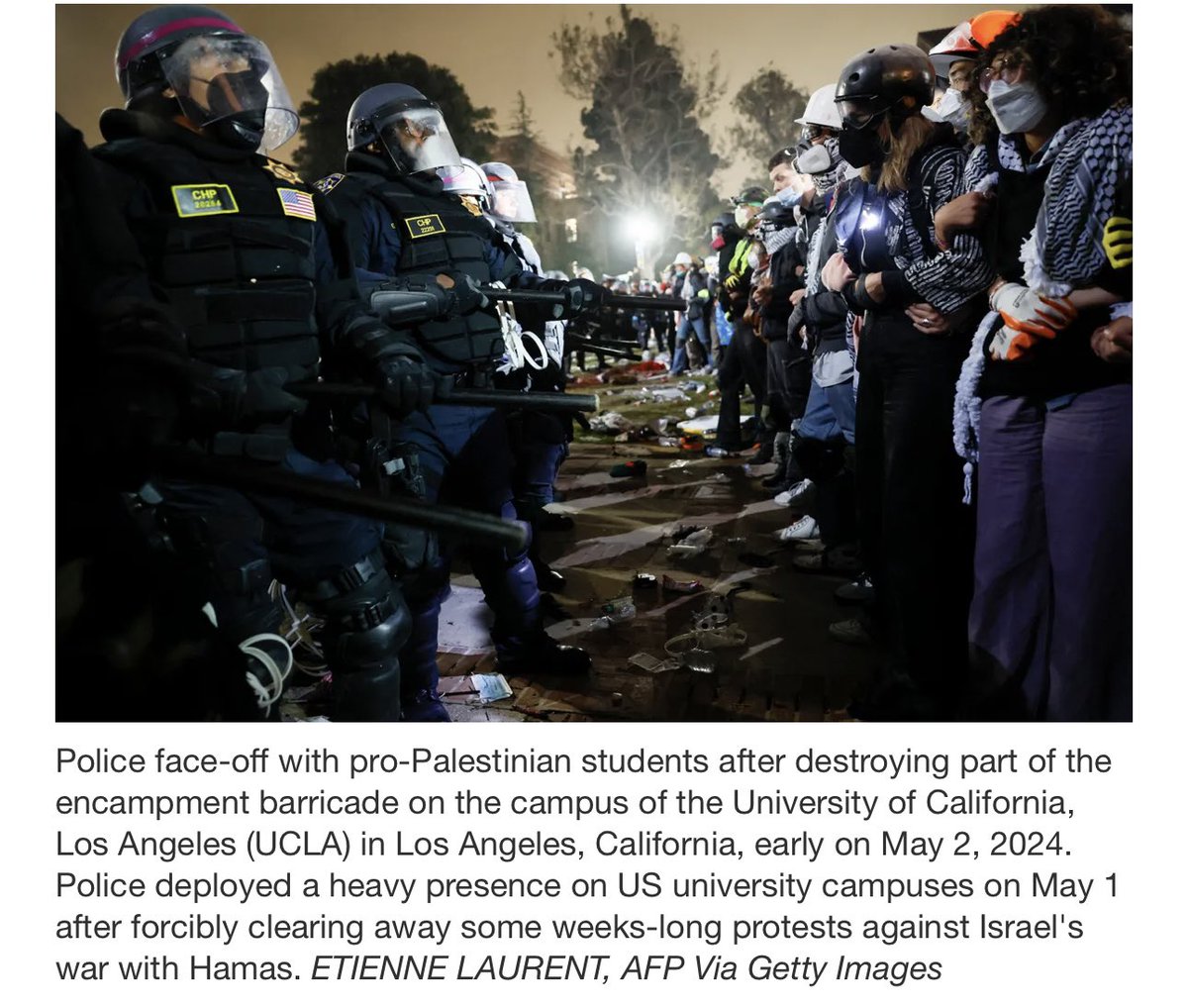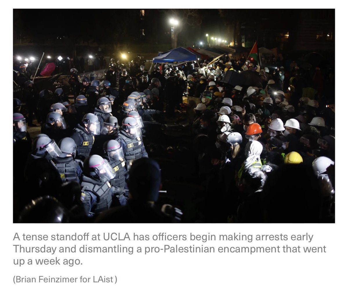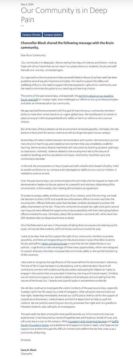 UCLA校长果然解释说,叫警察清场的原因是因为亲以色列暴徒对示威学生的袭击让示威营地成了暴力焦点。这啥逻辑?不去制止、抓捕暴徒,反而怪受害者惹事?不过他总算承认示威学生所主张的议题的重要性,而不是像某些大学校长那样把它说成是外来势力煽动的反犹主义事件。 https://t.co/osC1UutW87