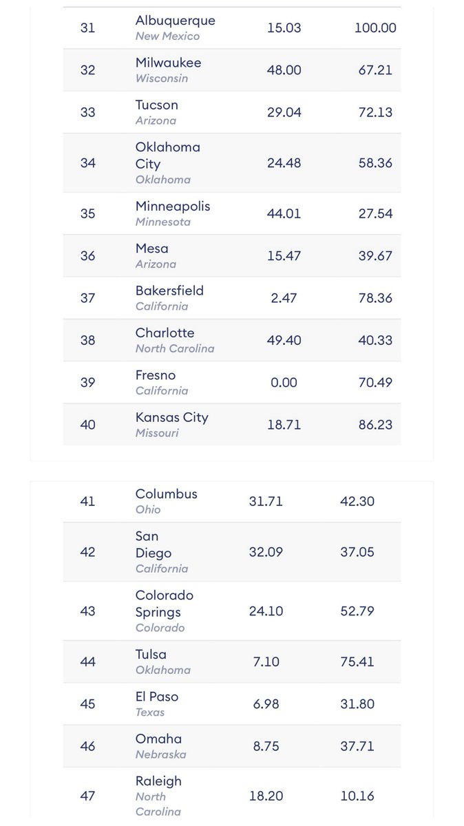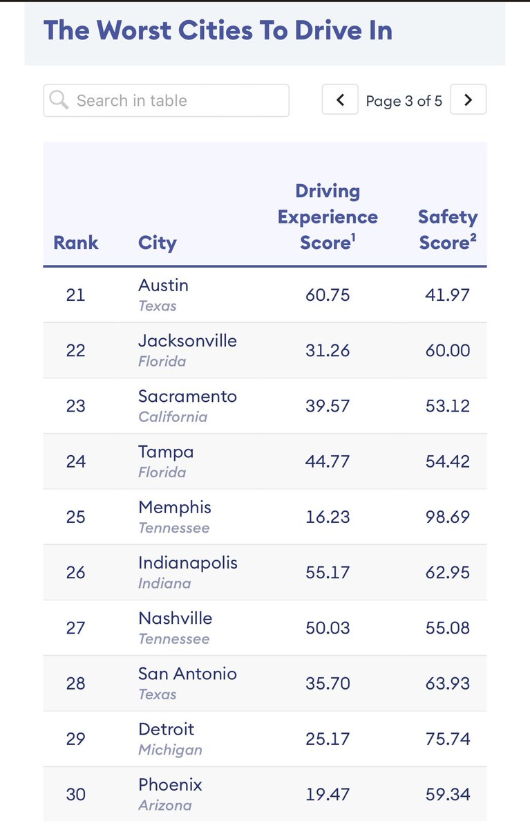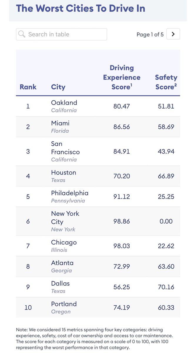 市内开车最差的城市:奥克兰、迈阿密、旧金山、休斯敦、费城、纽约、芝加哥、亚特兰大、达拉斯、波特兰。市内开车最不差的城市:罗利、奥马哈、埃尔帕索、塔尔萨、科罗拉多泉、圣地亚哥、哥伦布、堪萨斯市、弗雷斯诺、夏洛特。 https://t.co/o41XrrE7ox