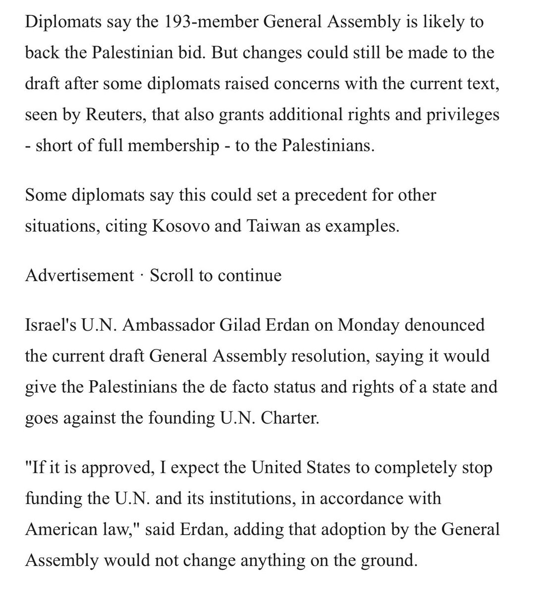 在巴勒斯坦加入联合国的申请被美国在安理会一票否决后,联合国大会将表决支持巴勒斯坦加入联合国。以色列驻联合国大使威胁说,如果联合国大会通过该决议,美国将会停止对联合国的所有资助。以色列还真毫不掩饰把自己当成美国的宗主国。 https://t.co/RjWS2B90Nt