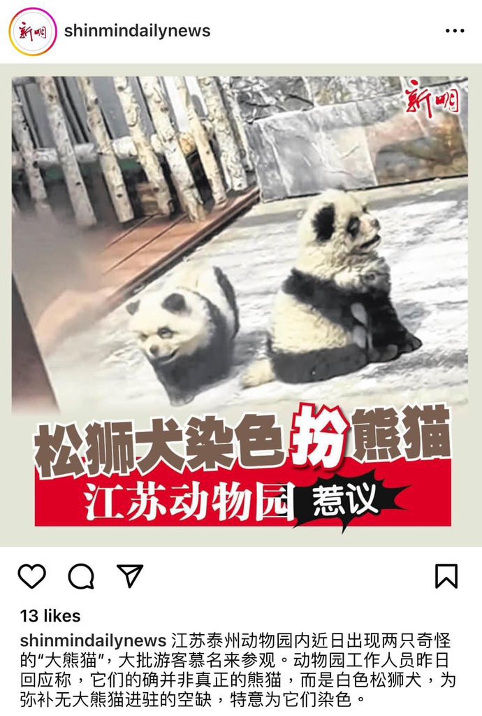 以前国外动物园有用驴染色扮斑马,现在中国动物园用狗染色扮熊猫,也是创新。 https://t.co/OBzU1EwDlF