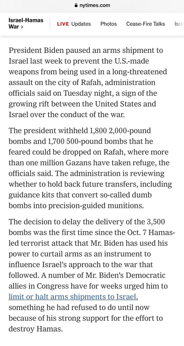 美国政府官员确认,拜登命令暂停向以色列提供3500发炸弹。此举象征意义大于实际意义。以色列有的是库存,都是美国以前提供的。 https://t.co/FePmXNEVkU