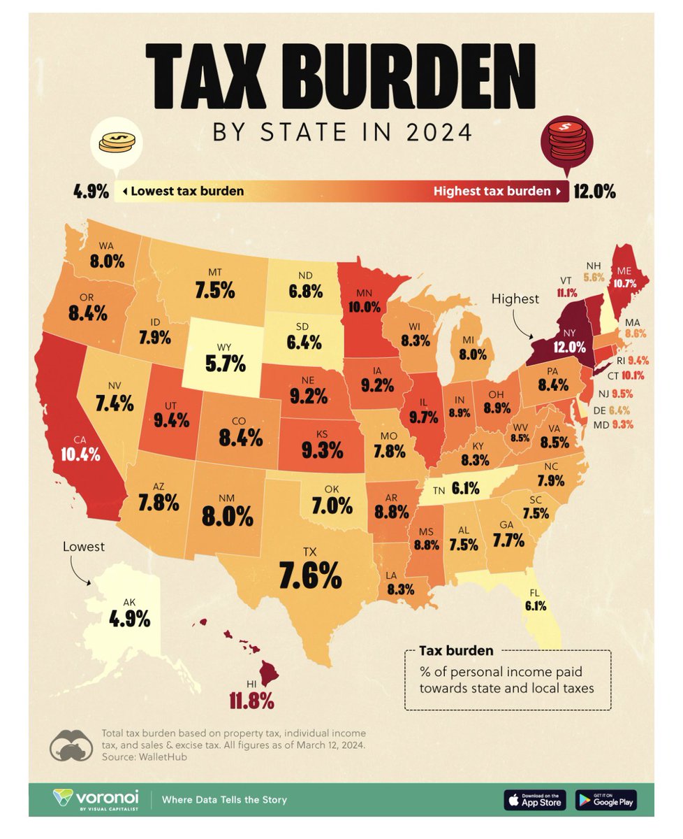 各个州的地方税(包括州收入所得税、房产税、销售税)占收入的比例。 https://t.co/SGitmGa3la