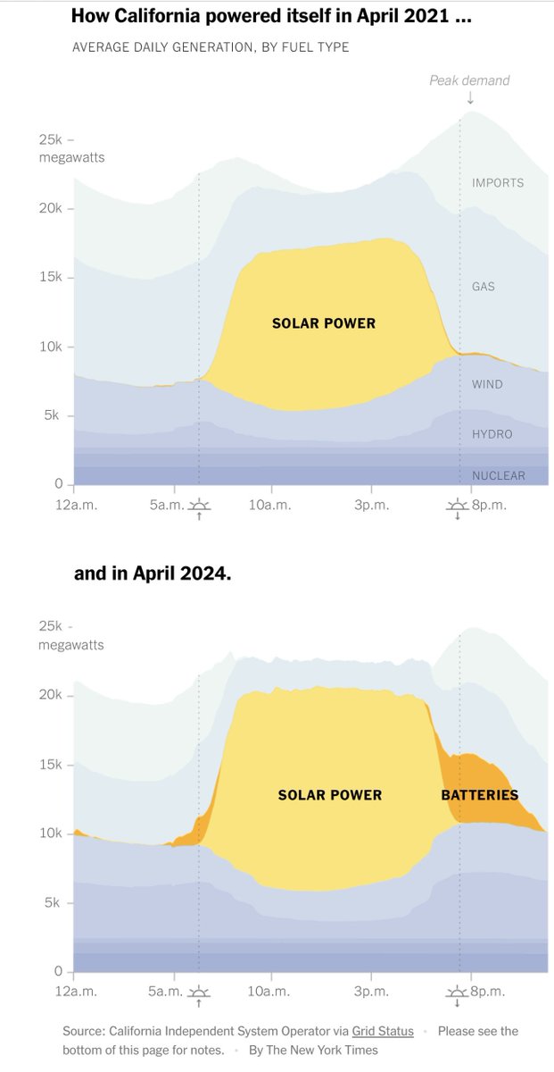 仅仅三年时间,加州大型蓄电池从无到有,现在蓄电池发电功率达到1万兆瓦,相当于7座大型核电站,提供夜晚发电的五分之一,是白天太阳能发电蓄电,减少了碳排放。得克萨斯也大建蓄电池,但是主要是为了缺电时赚钱(因为得州电价浮动,电力短缺时一度电能卖$5),甚至用火电蓄电,不减少碳排放。 https://t.co/ON1fN7biKj