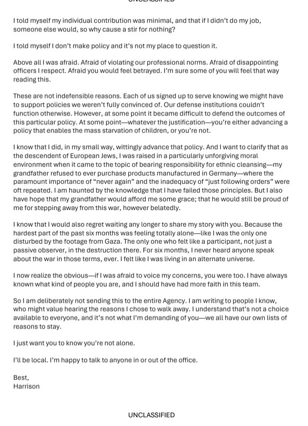 美国陆军情报分析官员Harrison Mann早在去年11月为抗议美国政府无条件支持以色列,不愿让自己成为杀害巴勒斯坦无辜平民的帮凶,愤而辞职。现在因为其辞职信被同事贴到网上,这事才被报道出来。在辞职信中他提到作为欧裔犹太人的后代,对种族清洗更难以容忍。 https://t.co/YPEpkE53Ap