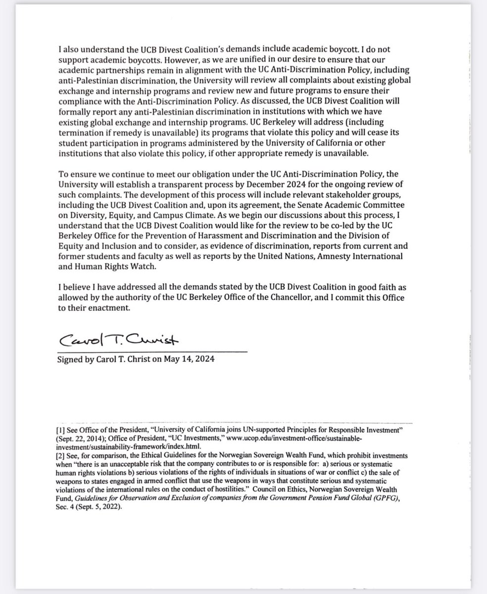 伯克利与扎营抗议学生达成协议,关注加沙数万巴勒斯坦人被杀和巴勒斯坦教育机构被毁,呼吁加沙立即永久停火,组建行动小组遵循人权原则审核投资和海外合作。哈佛大学也与扎营抗议学生达成协议,将讨论与加沙战争相关的投资、加速被停学学生的复学程序。伯克利、哈佛不愧是公立、私立大学的泰山北斗。 https://t.co/UkfcmkXSFd