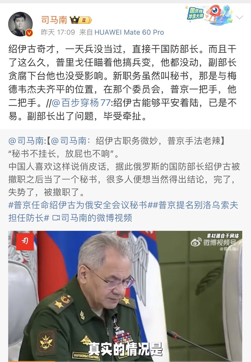 “绍伊古一战封神,三天拿下基辅”,“战神”改当安全会议秘书,“奇才”从此赋闲,以后最多和梅德韦杰夫一样耍耍嘴皮子。 https://t.co/R752lRLlVe