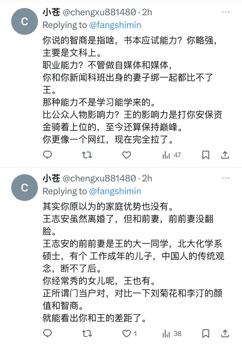 王志安日本血汗工厂的员工,说我只有文科比王志安强,也不觉得那是对其文科生老板的侮辱。这些还生活在大清朝的人渣,向人显摆王志安美满幸福的夫妻生活、王志安有“后”(可以继承其自媒体帝国吗?)。见过显摆妻子聪明漂亮的,第一次见到显摆前妻聪明漂亮的,这都是啥变态? https://t.co/ooMPBKe3Iq