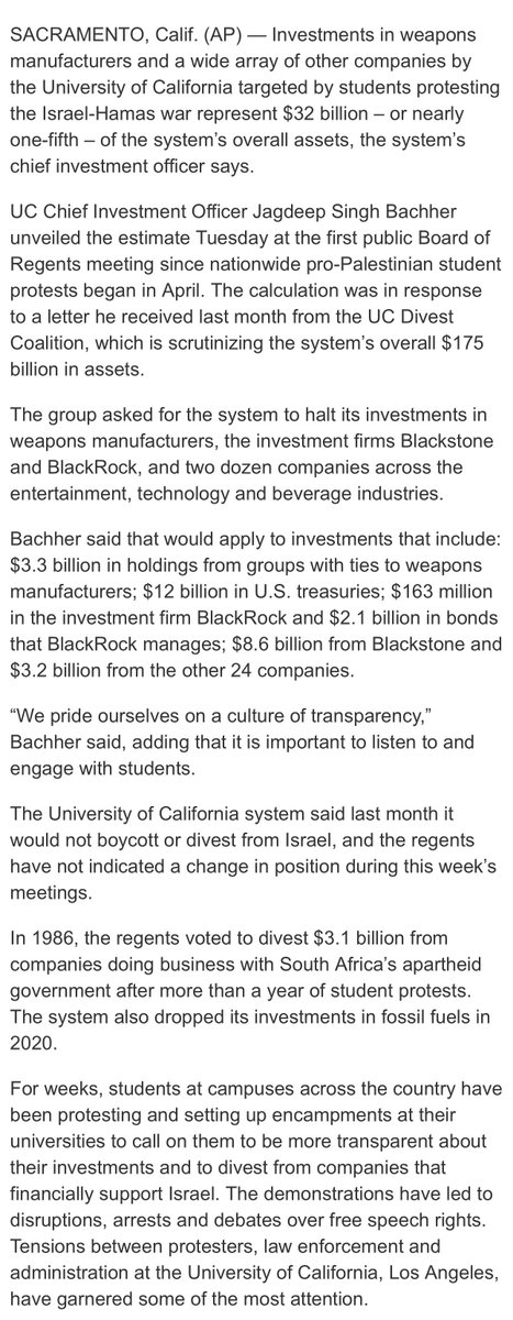 作为与抗议学生达成协议的一部分,加州大学今天公布了抗议学生针对的那些公司的投资情况。加州大学共有资产1750亿美元,其中320亿美元属于抗议学生希望撤资的部分,包括33亿投资于武器制造企业,120亿购买美国国债,1.63亿投资黑岩公司,21亿债券由黑岩管理,86亿投资黑石公司,24亿投资其他24家公司。 https://t.co/l6IXVJ7gYU