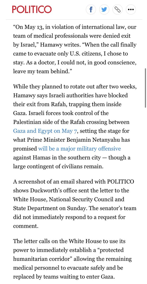 以色列不许在拉法医院工作的国际医务人员离境,包括曾经在战场上救过美国参议员的命的前军医。参议员把这名军医的信交给拜登。拜登又能干什么?以色列已经看破美国,知道不管作出什么骇人听闻的事美国都会支持它。 https://t.co/HOjOsZWBj2