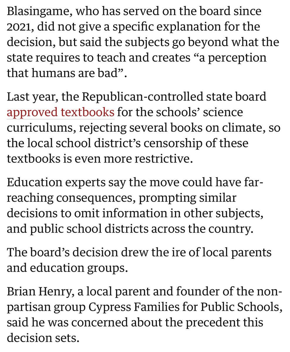 得克萨斯走向中世纪之课本审查:休斯敦一个学区教委6:1通过决议,将该学区使用的科学课本中关于疫苗、人类增长、多样性和气候变化涂掉,免得“毒害学生”。得克萨斯州教委通过的教学大纲只允许简单介绍气候变化,不许讲化石燃料的坏话,而这个学区教委干脆不许学生知道有气候变化这回事。 https://t.co/gwtT7ob8Od