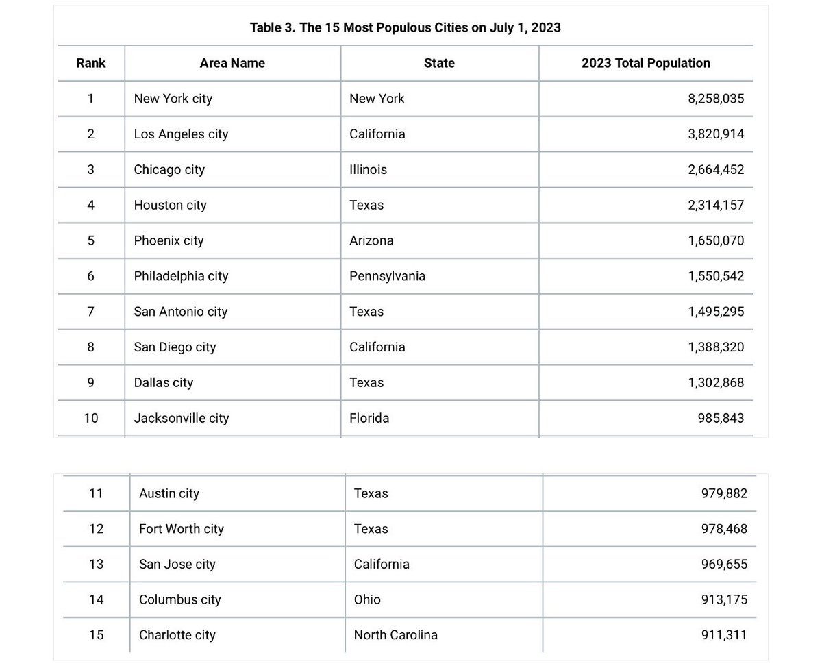 美国城市人口数量最新排名(截止2023年7月1日):纽约、洛杉矶、芝加哥、休斯敦、凤凰城、费城、圣安东尼奥、圣地亚哥、达拉斯、杰克逊维尔、奥斯汀、沃斯堡、圣何塞、哥伦布、夏洛特。 https://t.co/2MmnUoLlcX