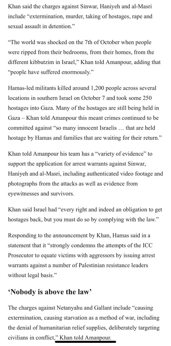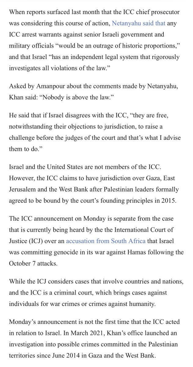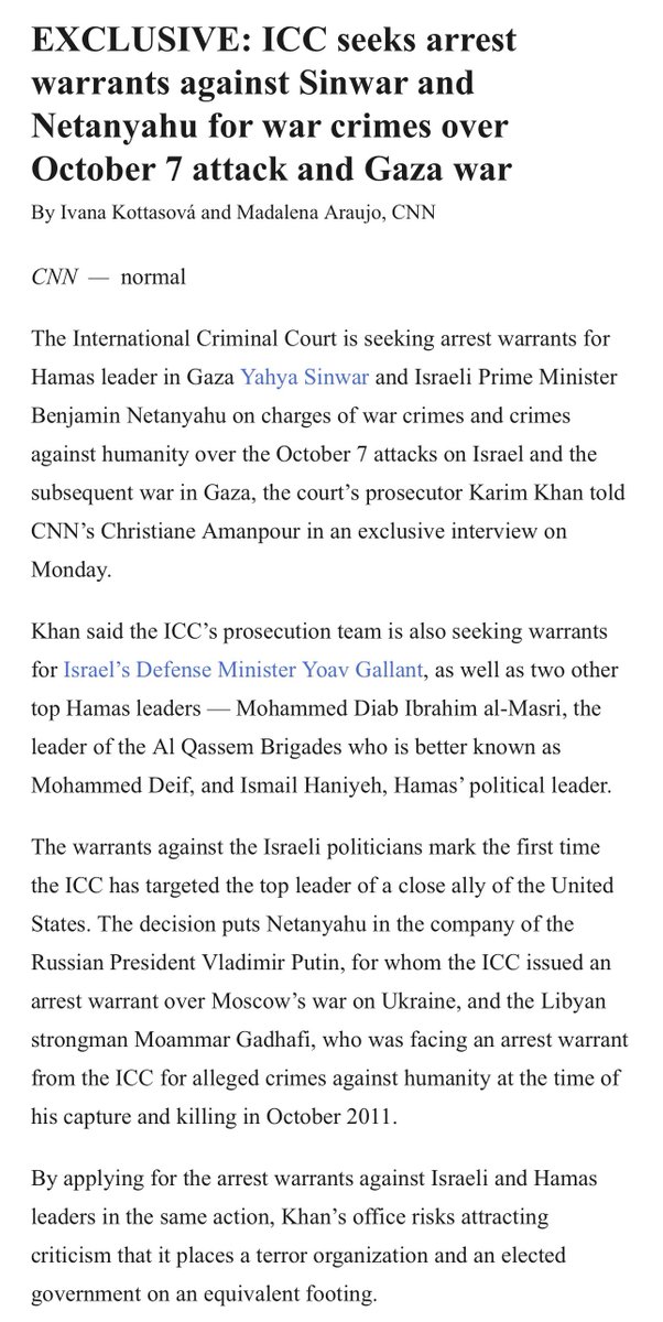 国际刑事法院检察官宣布,已向法官申请通缉三名哈马斯领导人和两名以色列领导人,包括内塔尼亚胡和以色列国防部长,指控以色列造成灭绝、把制造饥荒作为战争手段,包括拒绝提供人道主义救援物资、故意在冲突中针对平民。内塔尼亚胡气急败坏,享受到了普京待遇,以后只能去那些不承认国际刑事法院的国家访问,包括美国、俄国和中国。