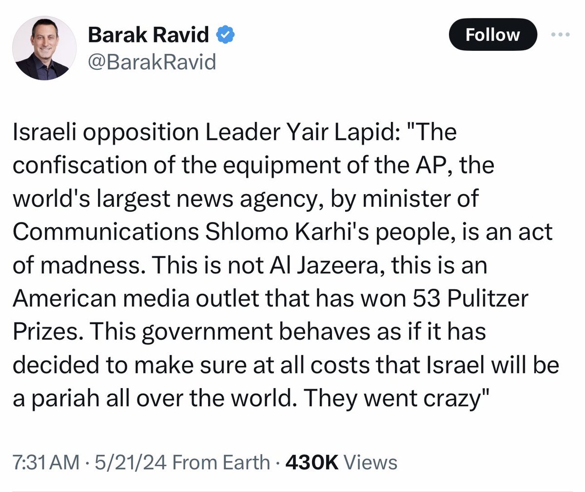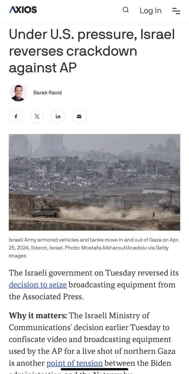 “中东唯一的民主自由国家”以色列没收了美联社的广播设备,在美国政府背后干预下才归还。美国政府公开可当没这回事。 https://t.co/wMsPZmLEOR