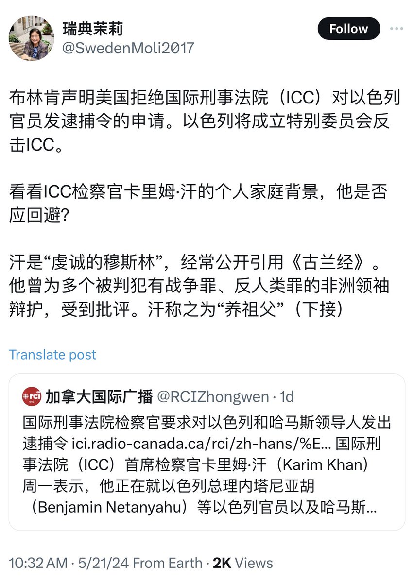 法治社会的基本原则是无罪推定,再穷凶极恶的嫌犯在审理时都有获得专业辩护服务的权利,如果请不起律师法庭还要指定免费的公共辩护律师。国际刑事法院也是如此。接受审判的战犯都已失势,没有辩护资源,所以国际刑事法院设置公共辩护律师办公室为战犯提供辩护服务。卡里姆.汗在2021年去竞选检察官之前长期为该办公室工作,这就是为什么他担任过多名战犯的辩护律师。控辩角色的转换在法治社会是司空见惯的事。那些吃六四人血馒头的“海外民运”人渣,人逃出了中国,心还留在中国,在法治社会生活多年却没有学会一点点法治观念,为了维护其以色列主子,竟把卡里姆.汗当国际辩护律师的履历当成其污点。