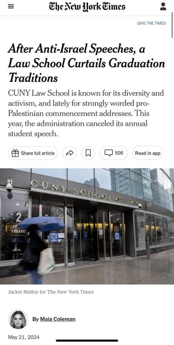 纽约城市大学法学院过去两年的毕业典礼学生代表都在演讲中支持巴勒斯坦、反对以色列,今年的毕业典礼干脆取消了学生代表演讲,从校外请的两名演讲者为抗议校方打压学生言论自由宣布不去演讲,于是今年的毕业典礼就没有演讲者。 https://t.co/RdiTIWCMcr