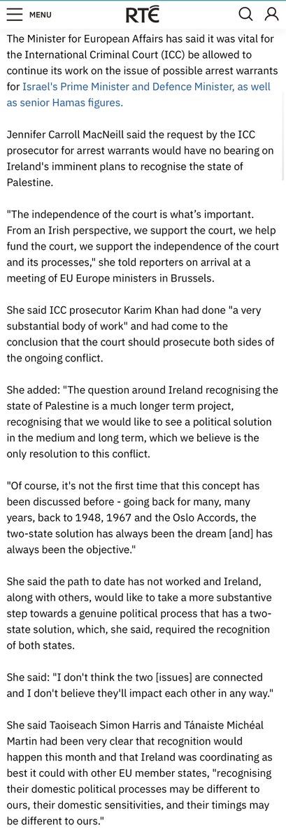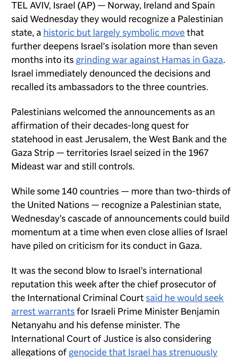 挪威、爱尔兰、西班牙宣布将承认巴勒斯坦国,以色列气急败坏地召回驻这三国大使。挪威、爱尔兰支持国际刑事法院通缉内塔尼亚胡,西班牙没有对此发表声明,但此前曾自愿给国际刑事法院检察官办公室捐款50万欧元专门用于调查发生在加沙的侵犯人权事件。意大利则抨击国际刑事法院,这些右派政权都无视法治 https://t.co/RrIFOSikij