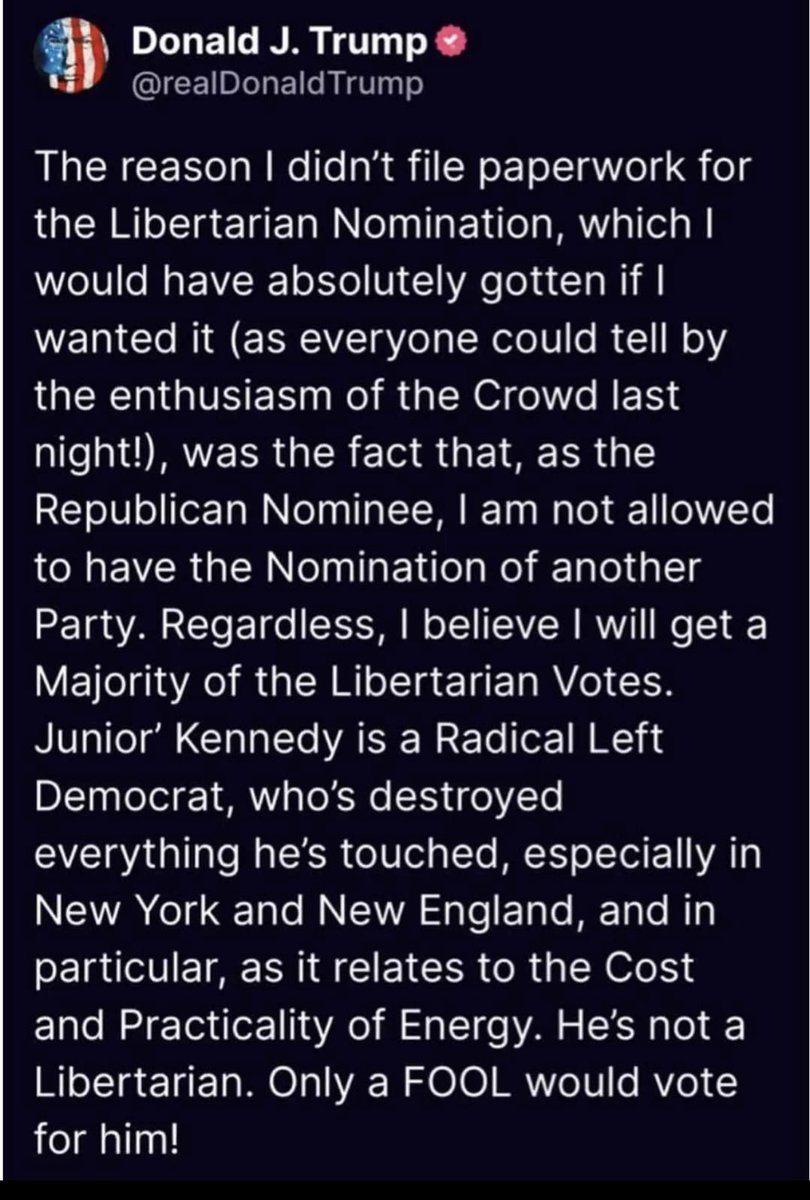 川普请求自由党全国大会提名他当自由党总统候选人,第一轮投票结果,川普得了6票(总共900多票)。川普说,他没有正式报名参选自由党总统候选人,不然肯定赢。 https://t.co/aMo2aJF3s9